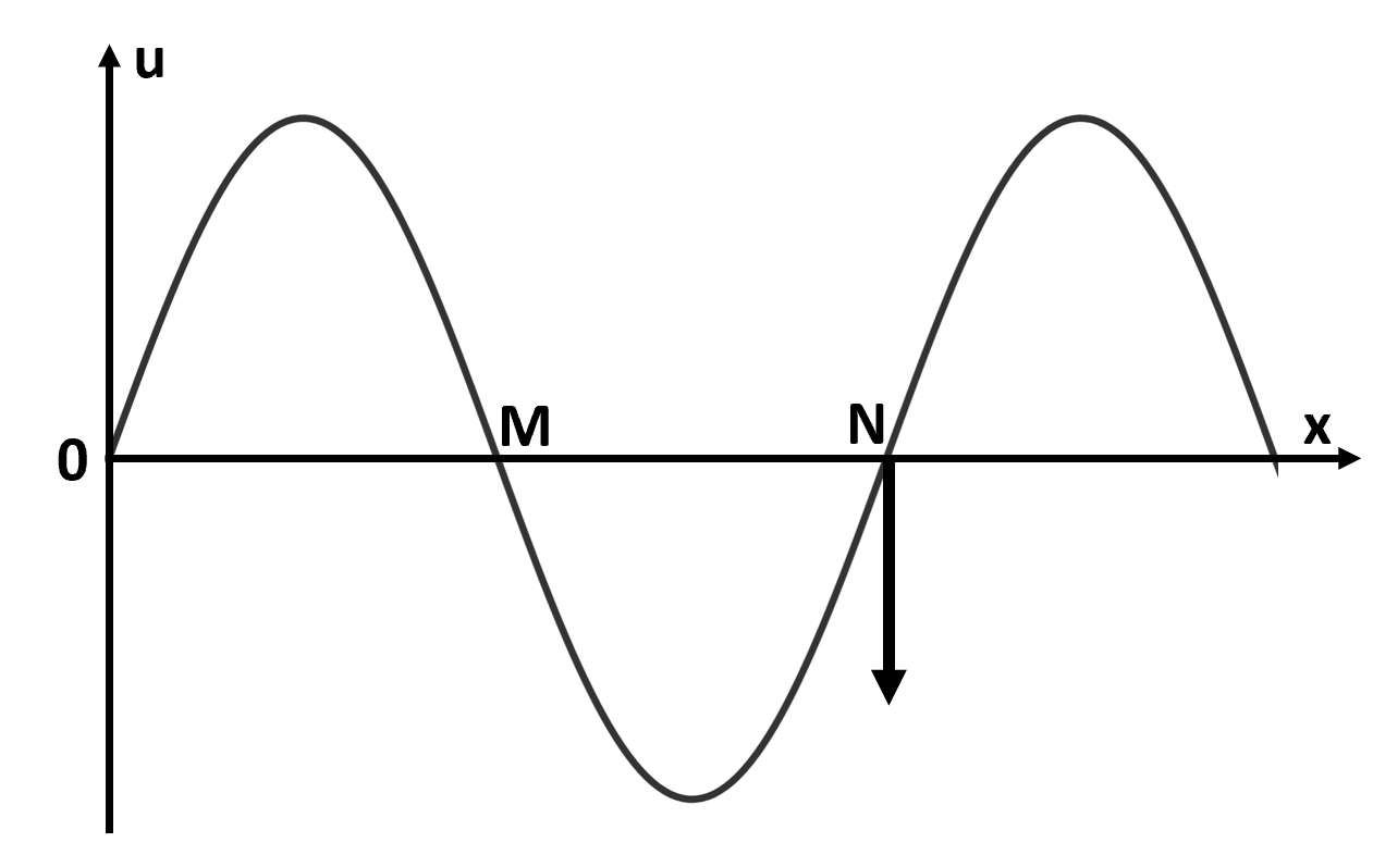 Một sóng hình sin đang lan truyền trên một sợi dây dài theo chiều dương của trục Ox. Tại thời điểm t, một đoạn dây có dạng như hình vẽ. Biết phần tử tại N đang chuyển động đi xuống. Khoảng cách giữa hai đỉnh sóng liên tiếp nhau là 4cm. Cho biết tốc độ truyền sóng là 3m/s. Tần số của sóng và hướng di chuyển của các phần từ tại O và M là: