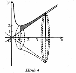 Một chiếc bát thủy tinh có bề dày của phần xung quanh là một khối tròn xoay, khi xoay hình phẳng \(D\) quanh một đường thẳng \(a\) bất kì nào đó mà khi gắn hệ trục tọa độ \(Oxy\) (đơn vị trên trục là decimet) vào hình phẳng \(D\) tại một vị trí thích hợp, thì đường thẳng \(a\) sẽ trùng với trục \(Ox\). Khi đó hình phẳng \(D\) được giới hạn bởi các đồ thị hàm số \(y = x + \dfrac{1}{x}\), \(y = x\) và hai đường thẳng \(x = 1\), \(x = 4\) (Hình 4). Thể tích của bề dày chiếc bát thủy tinh đó bằng bao nhiêu decimet khối? (làm tròn kết quả đến hàng phần mười).