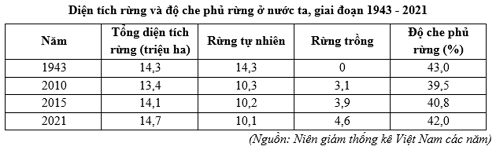 | d) Biểu đồ cột ghép là thích hợp nhất thể hiện diện tích rừng và độ che phủ rừng ở nước ta giai đoạn 1943 – 2021. |