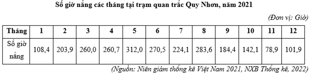 Căn cứ vào bảng số liệu trên, hãy cho biết số giờ nắng trung bình các tháng trong năm tại trạm quan trắc Quy Nhơn năm 2021 là bao nhiêu giờ? (làm tròn kết quả đến hàng đơn vị)