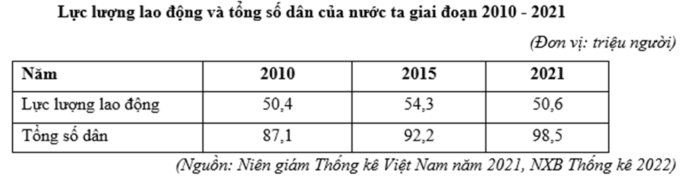 Căn cứ vào bảng số liệu, hãy cho cho biết tỉ lệ lao động của nước ta so với tổng dân số năm 2021 giảm đi so với năm 2010 là bao nhiêu % ? (làm tròn đến một chữ số thập phân)