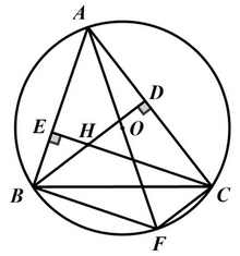Cho tam giác ABC nhọn có ba đỉnh nằm trêm đường tròn (O). Hai đường cao BD và CE cắt nhau