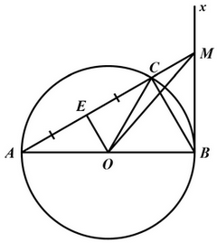 Cho đường tròn (O;R) đường kính AB. Dây BC = R. Từ B kẻ tiếp tuyến \(Bx\) với đường tròn. Tia AC cắt \(Bx\) tại M. Gọi E là trung điểm của AC. Chứng minh tứ giác OBME nội tiếp đường tròn.