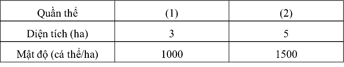 Giả sử 2 quần thể động vật được kí hiệu là (1), (2) có diện tích khu phân bố và mật độ cá thể như sau: