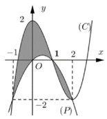 Hình phẳng \((H)\) được giới hạn bởi đồ thị \((\mathrm{C})\) của hàm số đa thức bậc ba và parabol \((P)\) có trục đối xứng vuông góc với trục hoành. Phần tô đậm như hình vẽ có diện tích bằng bao nhiêu? (Kết quả làm tròn đến hàng phần trăm).