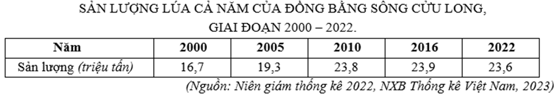 Căn cứ vào bảng số liệu, cho biết sản lượng lúa trung bình của Đồng bằng sông Cửu Long trong giai đoạn 2000 – 2022 là bao nhiêu triệu tấn? (làm tròn kết quả đến một chữ số thập phân).