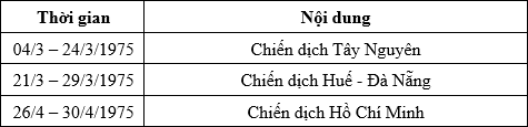 | a) Bảng thông tin trên thể hiện các chiến dịch trong cuộc Tổng tiến công và nổi dậy Xuân 1975. | ||