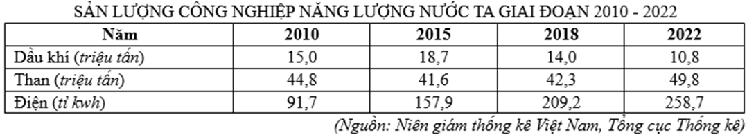 Theo bảng số liệu, tính tốc độ tăng trưởng sản lượng than nước ta năm 2022 so với năm 2010. (lấy năm 2010 làm gốc = 100% và làm tròn kết quả đến hàng đơn vị của %).