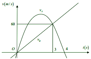 Cho đồ thị biểu thị vận tốc của hai xe \(A\) và \(B\) khởi hành cùng một lúc, bên cạnh nhau và trên cùng một con đường. Biết đồ thị biểu diễn vận tốc của xe \(A\) là một đường Parabol, đồ thị biếu diễn vận tốc của xe \(B\) là một đường thẳng ở hình bên. Hỏi sau khi đi được 3 giây, khoảng cách giữa hai xe là bao nhiêu mét?
