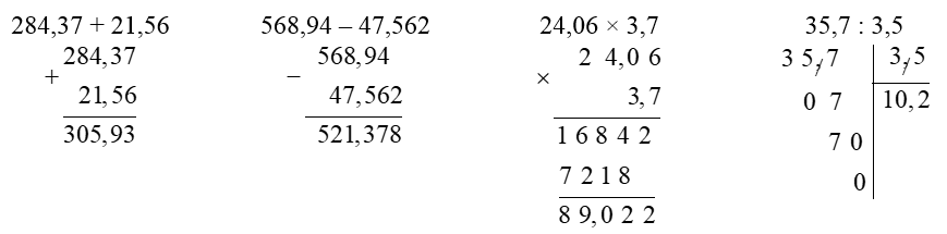 Đặt tính rồi tính: a. 284,37 + 21,56 b. 568,94 – 47,562 c. 24,06 × 3,7 d. 35,7 :