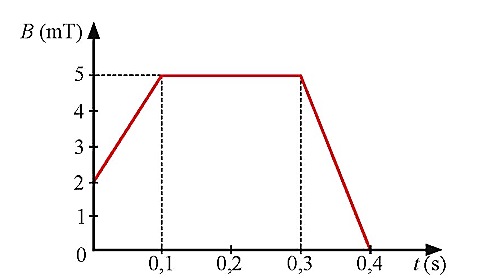 Một khung dây dẫn kín, phẳng có diện tích \(10c{m^2}\), gồm 100 vòng dây, đặt trong từ trường có vectơ cảm ứng từ vuông góc với mặt phẳng khung dây. Độ lớn cảm ứng từ biến thiên theo thời gian như đồ thị Hình vẽ. Độ lớn suất điện động xuất hiện trong khung dây trong khoảng thời gian 0 đến 0,1 s.