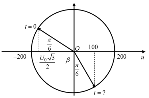 Điện áp hai đầu đoạn mạch có biểu thức \(u = 200\cos \left( {100\pi t + \dfrac{{5\pi }}{6}} \right)\) (u đo bằng vôn, t đo bằng giây). Trong khoảng thời gian từ 0 đến 0,01s điện áp tức thời có giá trị bằng 100V lần đầu tiên là ....... \({10^{ - 3}}\)giây? Kết quả làm tròn đến 1 chữ số thập phân.