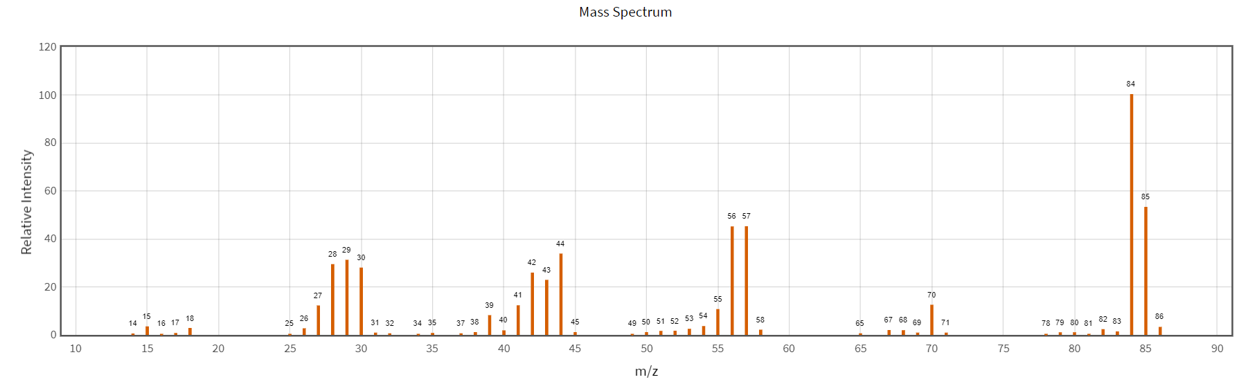 Piperidine hay có tên gọi khác pentamethylenimine là một amine dị vòng bao gồm một vòng sau cạnh chứa năm cầu nối methylene và một cầu nối amine. Nó là một chất lỏng không màu, có mùi khó chịu. Phân tích piperidine trên phổ MS thu được kết quả như hình. Xác định giá trị peak ion M+ của piperidine.