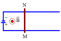 Một thanh nhôm MN, khối lượng 0,2kg chuyển động trong từ trường đều và luôn tiếp xúc với hai thanh ray đặt song song cách nhau 1,6m, nằm ngang, nằm trong mặt phẳng hình vẽ. Từ trường ngược hướng với trọng lực, có độ lớn \(B = 0,05T\). Hệ số ma sát trượt giữa thanh nhôm MN và hai thanh ray là \(\mu = 0,4\). Lấy \(g = 10m/{s^2}\). Khi cường độ dòng điện qua thanh nhôm không đổi bằng 12A thì nó chuyển động nhanh dần đều với gia tốc?