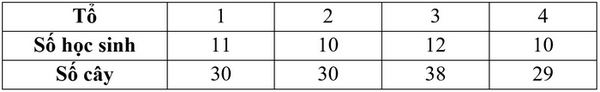 Lớp trưởng lớp 9A thống kê số học sinh và số cây trồng được theo từng tổ trong buổi ngoại khóa như sau:
