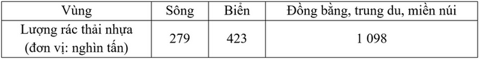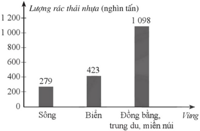 Theo số liệu thống kê từ Bộ Tài nguyên và Môi trường, mỗi năm Việt Nam có khoảng 1,8 triệu tấn rác thải nhựa thải ra môi trường. Biểu đồ cột ở hình sau biểu diễn số liệu về lượng rác thải nhựa mỗi năm của cả nước thải ra sông; biển; đồng bằng, trung du, miền núi.