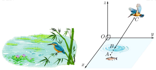 Với hệ trục tọa độ \(Oxyz\)sao cho \(O\) nằm trên mặt nước, mặt phẳng \(\left( {Oxy} \right)\)là mặt nước, trục \(Oz\) hướng lên trên (đơn vị đo: mét), một con chim bói cá đang ở vị trí cách mặt nước \(2m\), cách mặt phẳng \(\left( {Oxz} \right),\,\,\,\left( {Oyz} \right)\) lần lượt là \(3m\) và \(1m\) phóng thẳng xuống vị trí con cá, biết con cá cách mặt nước \(50\,cm\), cách mặt phẳng \(\left( {Oxz} \right),\,\,\,\left( {Oyz} \right)\) lần lượt là \(1m\) và \(1,5\,m\). Tọa độ điểm \(B\) lúc chim bói cá vừa tiếp xúc với mặt nước là \(\left( {a\,;\,b\,;\,c} \right)\). Tính \(T = 5a + 15b + 25c\).