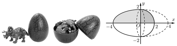 Một cái trứng khủng long đồ chơi là một khối tròn xoay được tạo thành từ 2 mảnh ghép lại. Biết mảnh trên được tạo thành khi xoay một phần tư đường elip với trục lớn là 8 và trục nhỏ là 4 quanh trục \(Ox\) và mảnh dưới được tạo thành khi xoay một phần tư đường tròn bán kính 2 quanh trục \(Ox\) như hình sau (bỏ qua độ dày của vỏ trứng).
