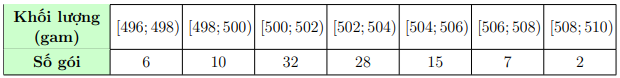 Một nhà máy sản xuất đường tiến hành kiểm tra khối lượng các gói đường được đóng gói bởi máy đóng gói tự động. Máy được coi là hoạt động tốt theo tiêu chuẩn của nhà máy nếu khối lượng trung bình (tính bằng gam) của các gói đường nằm trong khoảng \((500;504)\) và độ lệch chuẩn nhỏ hơn 3 gam. Kết quả kiểm tra được thống kê trong bảng dưới đây.