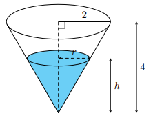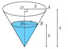 Một bể nước có dạng hình nón ngược với bán kính đáy bằng 2 m và chiều cao bằng 4 m (tham khảo hình vẽ dưới đây). Nước được bơm vào bể với tốc độ không đổi là 2 m3/phút. Hỏi tốc độ dâng lên của mực nước (đơn vị m/phút) bằng bao nhiêu khi mực nước trong bể đạt độ sâu bằng 3 m (làm tròn kết quả dến chư số hàng phần trăm)?