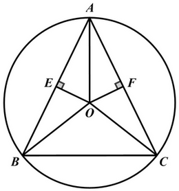 Cho tam giác ABC cân tại A nội tiếp đường tròn (O). Gọi E, F theo thứ tự là hình chiếu của (O) lên AB và AC. Chứng minh rằng AO là tia phân giác của góc BAC.