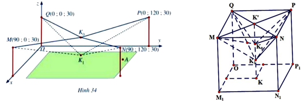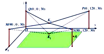 Người ta cần lắp một camera phía trên sân bóng để phát sóng truyền hình một trận bóng đá, camera có thể di động để luôn thu được hình ảnh rõ nét về diễn biến trên sân. Các kĩ sư dự định trồng bốn chiếc cột cao 30 m và sử dụng hệ thống cáp gắn vào bốn đầu cột để giữ camera ở vị trí mong muốn. Mô hình thiết kế được xây dựng như sau: Trong hệ trục tọa độ Oxyz (đơn vị độ dài trên mỗi trục là 1 m ), các đỉnh của bốn chiếc cột lần lượt là các điểm \(M(90;0;30),N(90;120;30),P(0;120;30),Q(0;0;30)\) (Hình 34 ). Giả sử \({K_0}\) là vị trí ban đầu của camera có cao độ bằng 25 và \({K_0}M = {K_0}N = {K_0}P = {K_0}Q\). Để theo dõi quả bóng đến vị trí \(A\), camera được hạ thấp theo phương thẳng đứng xuống điểm \({K_1}\) có cao độ bằng 19 (Nguồn: https://www.abiturloesumg.de; Abitur Bayern 2016 Geometrie VI).