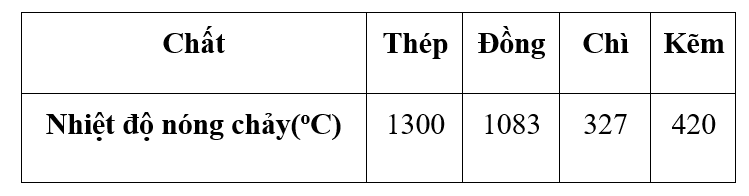 Cho nhiệt độ nóng chảy của một số chất như trong bảng. Khi thả một thỏi thép và một thỏi kẽm vào đồng đang nóng chảy. Thỏi nào nóng chảy theo đồng?