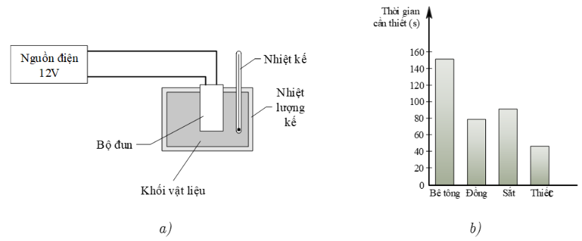 Một học sinh sử dụng bộ thiết bị như hình a) bên dưới để so sánh năng lượng nhiệt cần thiết để làm nóng những khối vật liệu khác nhau. Mỗi khối có khối lượng bằng nhau và có nhiệt độ ban đầu là \({20^0}{\rm{C}}\). Học sinh đó tiến hành đo thời gian cần thiết để nhiệt độ của mỗi khối vật liệu tăng lên thêm \({5^0}C\). Kết quả được biểu diễn trên hình \(b)\) bên dưới. Vật liệu nào có nhiệt dung riêng nhỏ nhất?