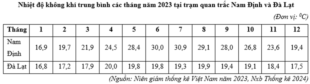 Căn cứ vào bảng số liệu trên, hãy cho biết nhiệt độ không khí trung bình năm ở Nam Định lớn hơn ở Đà Lạt bao nhiêu 0C (làm tròn kết quả đến một chữ số thập phân).
