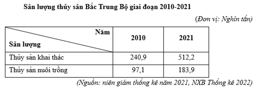 Căn cứ vào bảng số liệu, hãy cho biết tỉ trọng sản lượng thủy sản khai thác ở Bắc Trung Bộ năm 2021 tăng bao nhiêu phần trăm so với năm 2010? (làm tròn kết quả đến một chữ số thập phân)