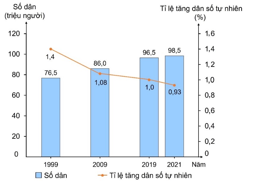 Biểu đồ quy mô dân số và tỉ lệ tăng dân số nước ta giai đoạn 1999 – 2021