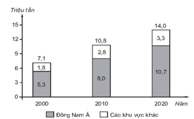 Cho biểu đồ: Biểu đồ sản lượng cao su khu vực Đông Nam Á và các khu vực