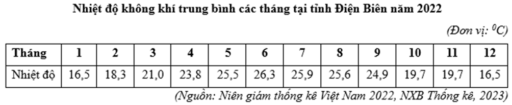 Căn cứ vào bảng số liệu, hãy cho biết biên độ nhiệt độ không khí trung bình năm của Điện Biên năm 2022 là bao nhiêu 0C (làm tròn kết quả đến một chữ số thập phân).