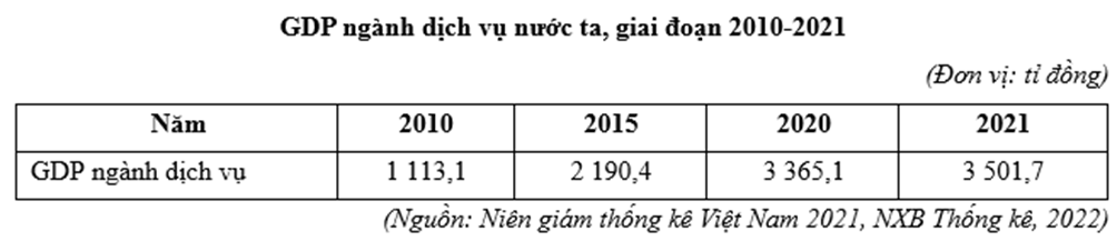 Căn cứ vào bảng số liệu trên, hãy cho biết so năm 2020 với năm 2015, GDP ngành dịch vụ của nước ta tăng bao nhiêu lần? (Làm tròn kết quả đến một chữ số thập phân)