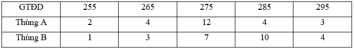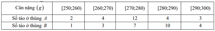 Hai thùng hàng A, B đều chứa 25 quả táo. Kết quả kiểm tra cân nặng của 25