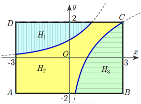 Một bức tường hình chữ nhật \(ABCD\) có kích thước \(6{\rm{ (m)}} \times {\rm{4 (m),}}\) được bạn An trang trí bằng cách vẽ hai đồ thị \(f(x) = {a^x},\) \(g(x) = {\log _b}x\) đối xứng nhau qua đường thẳng \(d:y = x\) và chia thành ba phần (tham khảo hình vẽ bên). Phần \({H_1}\) được sơn màu xanh da trời, phần \({H_2}\) được sơn màu vàng, phần \({H_3}\) được sơn màu xanh lá cây. Biết rằng mỗi hộp sơn các màu chỉ sơn được \(3{\rm{ (}}{{\rm{m}}^{\rm{2}}}{\rm{)}}\) tường, đồng thời giá của hộp sơn màu xanh da trời là \(100.000\) đồng\(/\)hộp, hộp sơn vàng là \(140.000\) đồng\(/\)hộp, hộp sơn xanh lá cây là \(130.000\) đồng\(/\)hộp. Tính giá tiền bạn Hà mua để sơn bức tường này ? (đơn vị là triệu đồng và cửa hàng sơn chỉ bán số nguyên của hộp).