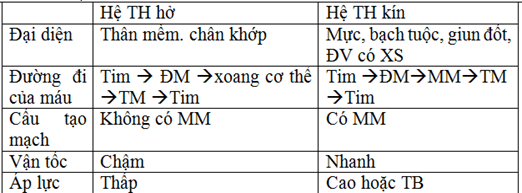 So sánh hệ TH hở và hệ TH kín về: Đại diện, đường đi của máu, cấu tạo hệ mạch, vận tốc máu, áp lực máu.