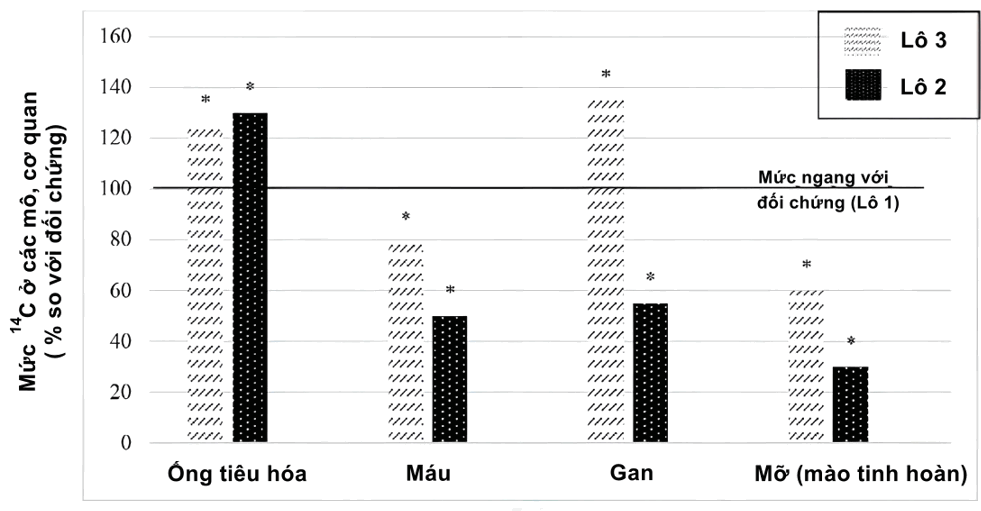 Giải thích tại sao lô 3 có lượng 14C ở ống tiêu hóa cao nhưng ở các cơ quan khác lại thấp?