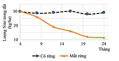 Theo biểu đồ, khi rừng bị chặt phá, lượng nitrogen trong đất giảm mạnh, từ mức ban đầu (~30 kg/ha) xuống còn 10 kg/ha sau 24 tháng. Ngược lại, nơi có rừng, lượng nitrogen trong đất giữ mức ổn định quanh 30 kg/ha.