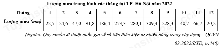 Căn cứ vào bảng số liệu trên, tính tổng lượng mưa của các tháng trong mùa mưa năm 2022 của TP. Hà Nội (làm tròn kết quả đến hàng đơn vị của mm).