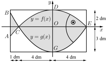 Trên cửa sổ có dạng hình chữ nhật, họa sĩ thiết kế logo hình con cá cho một doanh nghiệp kinh doanh hải sản. Logo là hình phẳng giới hạn bởi hai parabol với các kích thước được cho trong hình sau (đơn vị trên mỗi trục toạ độ là decimét). Tính diện tích của logo đó (đơn vị dm2, làm tròn kết quả đến hàng phần mười