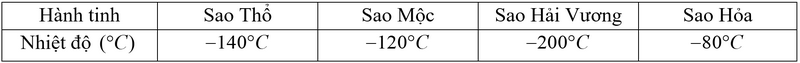 Cho biết nhiệt độ của 4 hành tinh trong cùng một thời điểm như sau: