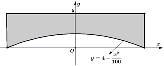 Ứng dụng tích phân tính diện tích hình phẳng giới hạn bời Parabol và trục hoành là \(S=\int_{-20}^{20}\left(4-\dfrac{x^2}{100}\right) \mathrm{d} x\).