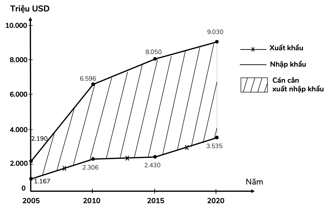 Dựa vào biểu đồ, phát biểu nào sau đây đúng về giá trị xuất khẩu, nhập khẩu dịch vụ vận tải của nước ta giai đoạn 2005 – 2020?