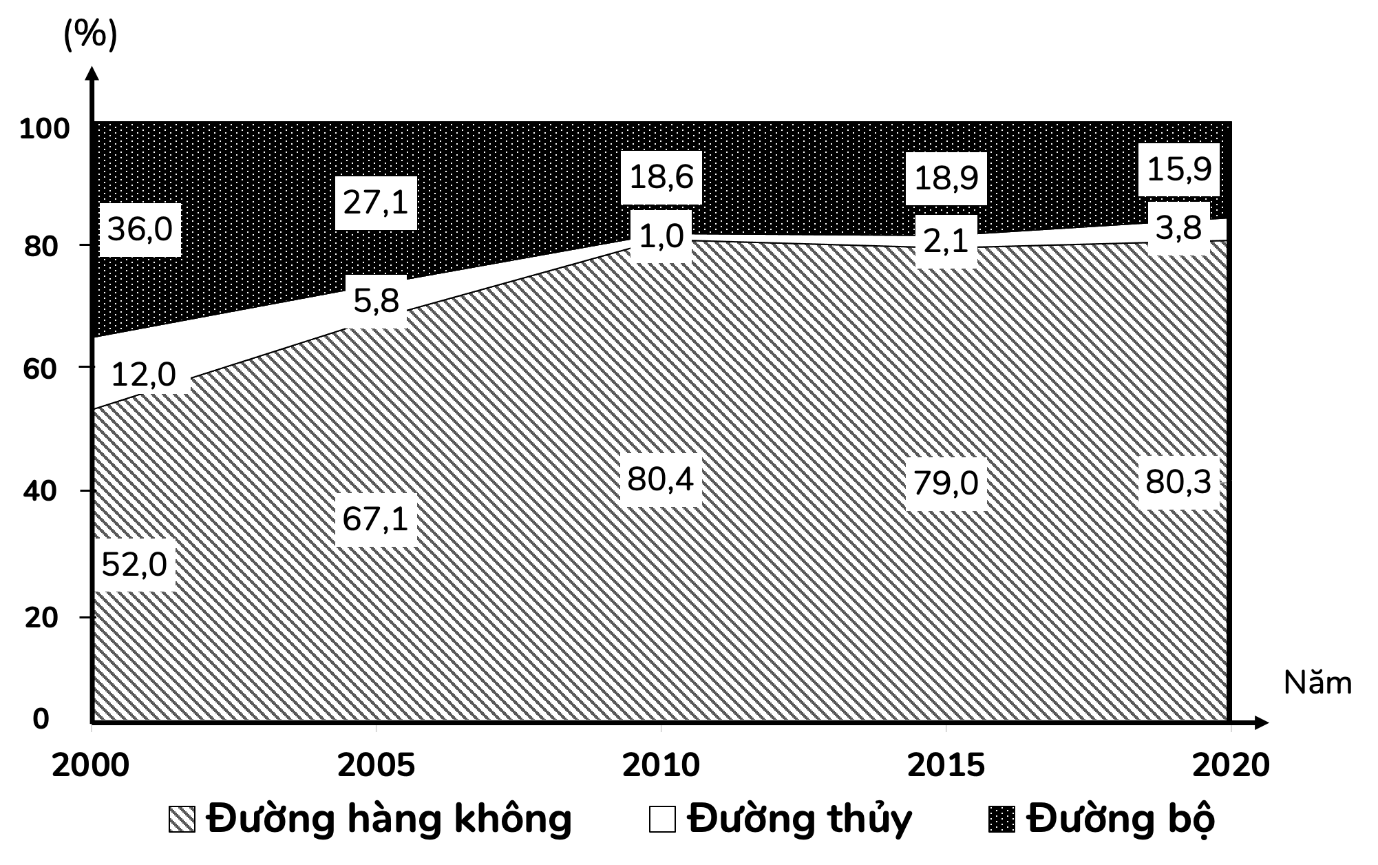 Dựa vào biểu đồ, phát biểu nào sau đây đúng về cơ cấu khách quốc tế đến nước ta phân theo loại hình vận tải giai đoạn 2000 – 2020?