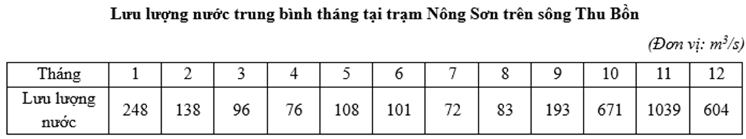 Căn cứ vào bảng số liệu trên, hãy cho biết lưu lượng dòng chảy trung bình năm tại trạm Nông Sơn trên sông Thu Bồn là bao nhiêu m3/s (làm tròn kết quả đến hàng đơn vị).