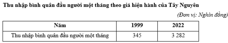 Căn cứ vào bảng số liệu trên, hãy cho biết tốc độ tăng trưởng thu nhập bình quân đầu người một tháng theo giá hiện hành của Tây Nguyên năm 2022 so với năm 1999 là bao nhiêu % (làm tròn kết quả đến hàng đơn vị).