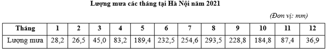 Căn cứ vào bảng số liệu trên, hãy cho biết sự chênh lệch giữa tổng lượng mưa thời kì mùa mưa so với tổng lượng mưa thời kì mùa khô ở Hà Nội năm 2021 là bao nhiêu mm (làm tròn kết quả đến hàng đơn vị).