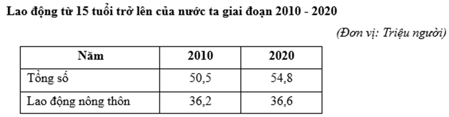 Căn cứ vào bảng số liệu trên, hãy cho biết tỉ lệ lao động nông thôn trong tổng số lao động từ 15 tuổi trở lên của nước ta năm 2020 so với năm 2010 thay đổi bao nhiêu % (làm tròn kết quả đến một chữ số thập phân).