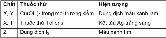 Kết quả thí nghiệm của các dung dịch X, Y, Z, T với thuốc thử được ghi ở bảng sau:Các chất